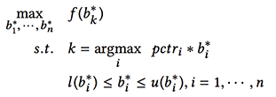 在给定上下界的范围内优化出价可以帮助广告主获得更高质量的流量以及更高的ROI。但是,约束空间内解的不同出价会导致不同的eCPM排序,并最终影响平台收益和其它指标的效果。因此,该算法提出了一种在eCPM排序机制下,对综合指标保优的出价调整算法。其核心解决的优化问题如公式(5)。