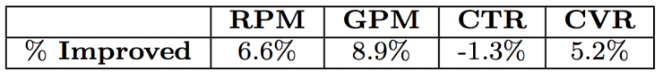 除了单品广告场景,该算法在淘宝移动端首页顶部的Banner广告中也明显提升了商家的成交额和转化率,如表4。从商品的类目视角分析,表5的数据表明17%的类目(占62%的浏览量)流量的商家GPM和ROI获得了同时提升,27%的类目(占21%的浏览量)流量的GPM获得了提升,另有30%的类目(占12%的浏览量)显示出流量数量和质量的置换(与单品广告分析相似,其转化效果也获得了提升)。