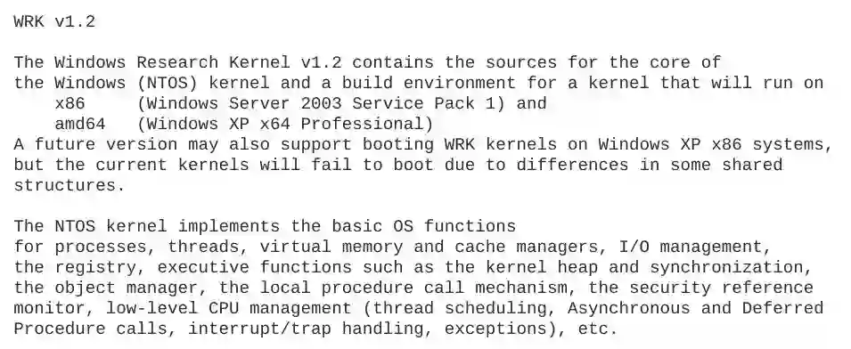 目前在 GitHub 上其实可以找到 Windows 内核研究的泄露副本,虽然这些代码已经过时且很不完整,但它们还是具有很高的研究价值。