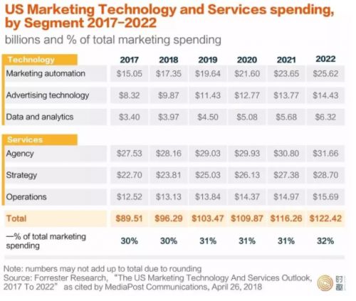 时趣互动创始人张锐指出,2017年,美国企业营销市场是2984亿美金。其70%/2088亿美金用于采购各种媒体广告;30%/895亿美金用于营销技术和服务采购;9.2%/275亿美金是媒介代理服务费用;策略服务中,创意(Strategy)和运营服务(Operations)的钱分别是7.6%/227亿和4.2%/125亿, 两者加在一起占总体的11.8%;然后MarTech的市场为5%/150亿美元, AdTech的市场为3.2%/83.2亿美金,数据分析和服务市场为1.1%/34亿美金。
