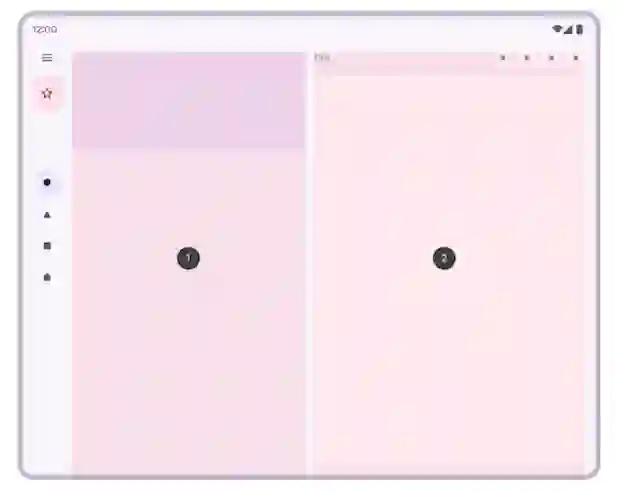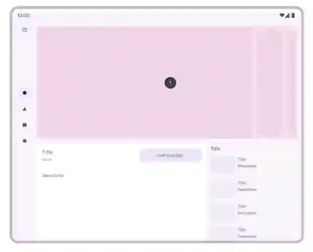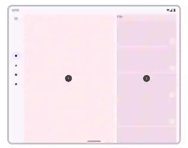 与其他大屏幕设备一样,我们需要多想想用户会怎样握持未折叠设备?如平板电脑,部分屏幕区域难以用大拇指触及,用户也很难腾出整只手来自由操控屏幕。用户轻易就能触及屏幕的底部角落,但可能无法触及屏幕最顶端,尤其是在竖屏模式下。这意味着如果您使用 Navigation rail 这类组件,将导航按钮居中或固定在屏幕底部,这会更便于用户的操作。
