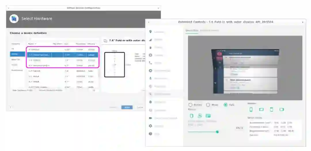 在如此多样化的硬件生态系统中,您可能很难拥有各种形状和尺寸的设备,如今 Android SDK 为可折叠设备提供了模拟器图像,这些模拟器允许您随时将折叠状态更改为铰链的角度。即将推出的 Android Studio Chipmunk 也会配备可调整尺寸的模拟器,允许您自由改变应用窗口的尺寸,每个开发者都可以在几乎任何类型的设备中试用他们的应用。