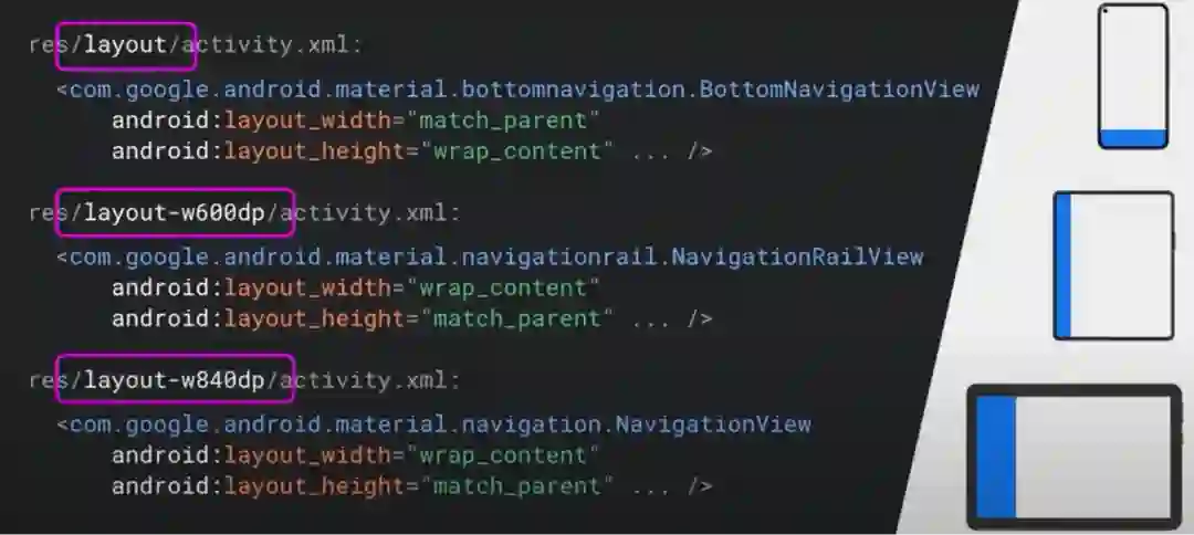 如需构建响应式界面,我们应该优先考虑界面中长驻元素的位置,例如导航元素。遵循 Material 指南,我们可以根据宽度的尺寸类别提供替代布局,将导航调整到最方便使用的位置。例如,小屏幕采用底部导航视图,中等屏幕采用 Navigation rail,大屏幕采用完整导航视图。请大家注意,这些布局采用的是宽度限定符 "-w",而非最小宽度限定符 "-sw"。剩余空间用于排列内容,我们可以在这些空间应用规范布局。