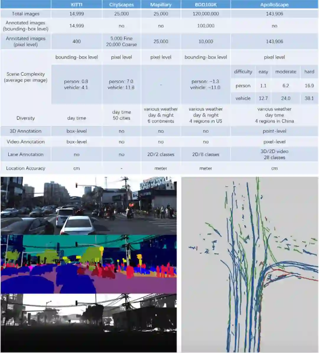 图 2:ApolloScape 数据集及其扩展。上:ApolloScape 与其他流行数据集的对比。下左:RGB 图像、注释和点云(从上到下);下右:数据集中一些有标记的交通轨迹。