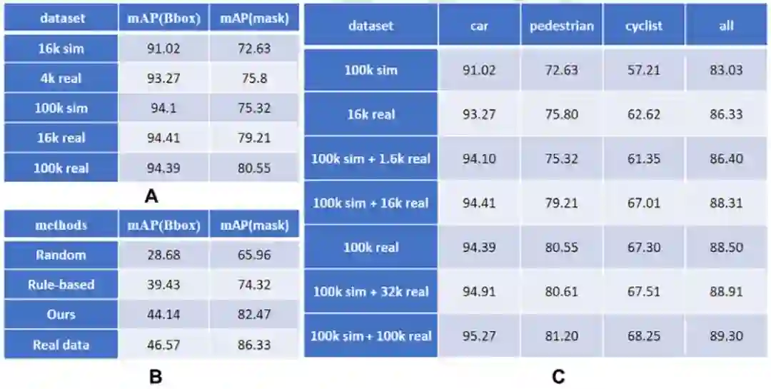 图 6:LiDAR 模拟评估。(A)用于实时实例分割的数据集大小和类型(真实或模拟)评估。(B)不同对象放置方法的评估结果。(C)使用实例分割的真实数据增强评估(均值掩码 AP)。