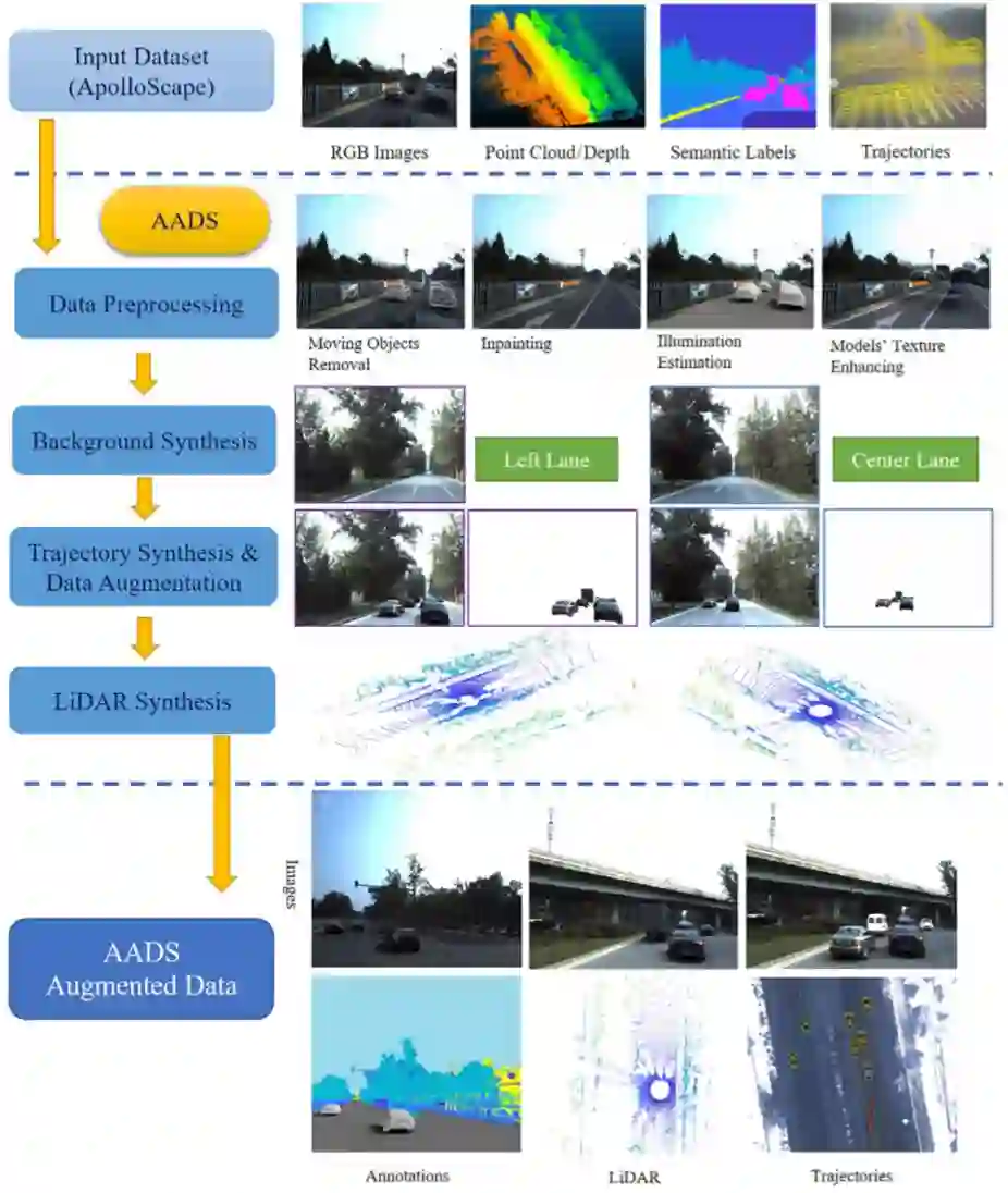 本文中,百度展示了一种增强现实的自动驾驶仿真系统(AADS)。其构想是通过模拟交通流来增强现实世界图像,进而创建逼真的仿真图像和渲染。更具体地说,百度使用激光雷达(LiDAR)和相机扫描街景。根据获得的轨迹数据,为汽车和行人生成了看似合理的交通流,并将其合成到背景中。合成图像也可以基于不同视角和传感器模型(相机或 LiDAR)进行再合成。生成的逼真图像添加了完整注释,并且可用于从感知到规划的自动驾驶系统训练和测试。