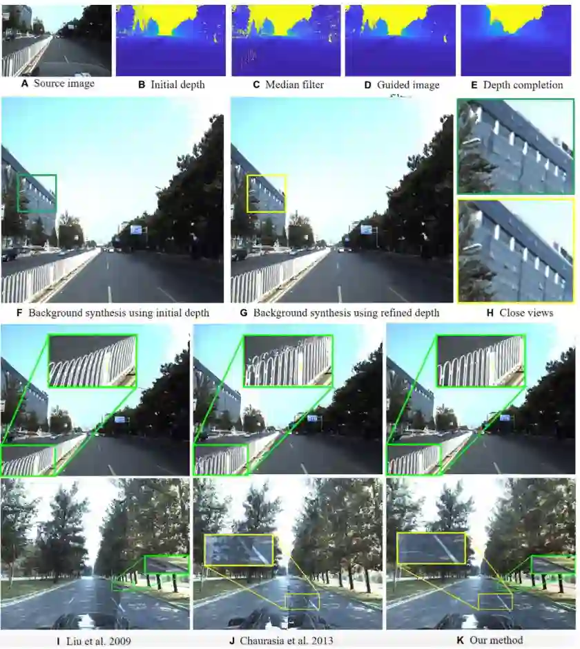 图 3:深度提取的视图合成结果和有效性。A 和 B:数据集中的原始 RGB 图像和深度图像。C 到 E:过滤和完成之后的深度提取。F 和 G:在 (H) 中使用初始和提取深度以及近视图进行视图合成的结果。I 到 K:利用 Liu 等人、Chaurasia 等人以及百度的方法进行视图合成的最终结果。
