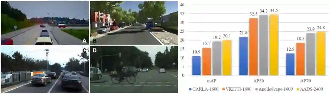 图 5:RGB 图像增强评估。左边的四张图像是从 CARLA(A)、VKITTI 数据集(B)、百度的 AADS-RGB 数据集(C)和测试数据集 CityScapes(D)中选取的。右边的条形图显示了评估结果。