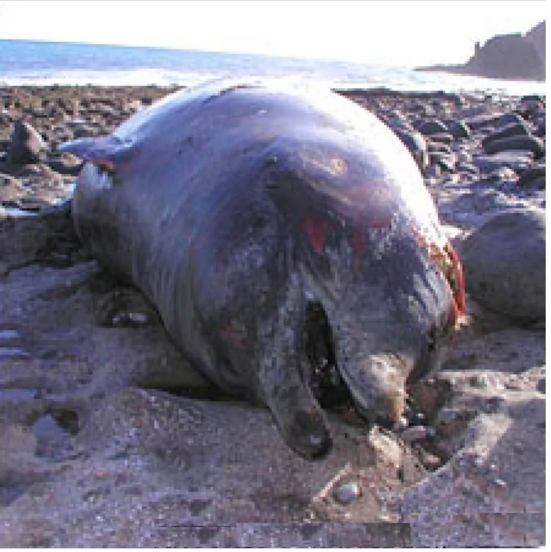 近些年来,人们发现很多的海洋生物(主要是鲸鱼和海豚等)搁浅事件与海军的军事演习在时间和空间上有着很强的关联。2002年9 月24日,有10个国家参与的北大西洋公约组织的代号为“Neo Tapon2012”的国际海军演习在西班牙加那利群岛附近进行。在使用主动声纳4小时后,演习地点附近发现有14头不同种类的海洋生物搁浅(图10)。随后,科学家通过解剖搁浅的海洋生物尸体(图11)指出海军演习过程中使用的声纳可能是造成此事件的罪魁祸首。在搁浅的海洋动物体内(尤其是肝脏),发现了大量的不同尺度的空泡(图11)。在局部部位,空泡体积甚至占到总体积的90%。一些微小空泡(直径在50~750 mm 之间)的存在可能导致海洋生物的肝脏组织被压缩、血管膨胀、局部出血和严重的细胞坏死等。