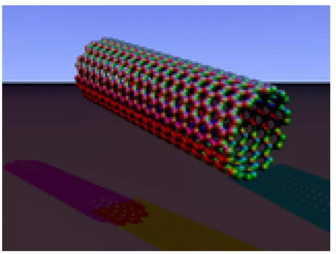 碳纳米管(图13)是一种圆柱形中空的纳米结构,是碳元素的一种同素异形体(即相同元素组成,但不同形态的单质)。碳纳米管自1991 年被发现以来,由于其超常的强度,良好的柔韧性,高熔点等独特的性质引起了学术界的广泛关注。例如,2012年10月29日,IBM 的研究人员宣称采用主流半导体工艺第一次将一万多个碳纳米管制作的晶体管精确地放置在了一颗芯片内,并通过了可行性测试,迈出了纳米材料取代硅的第一步。工业生产出来的碳纳米管的微观特性(如长度和直径等)参差不齐,需要进一步的处理(如切割等)。