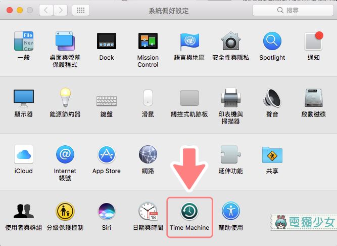 我以为这篇文章会写很久,但其实备份这件事真的比我想像中的简单太多了!教你们一步一步做,就不怕做错了,首先接上你的外接硬盘,我们会使用到的备份软件是苹果内置的 Time Machine,选择桌布左上角的苹果菜单()>>「系统偏好设定」,然后按一下「Time Machine」。