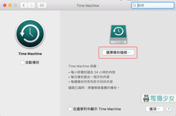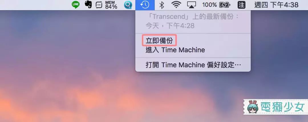 那如果你像贝尔一样不会一直插着硬盘,当你想备份的时候插上硬盘,可以点选『选项列的 Time Machine 选项 中「立即备份」』,就可以再帮电脑进行备份啰