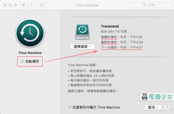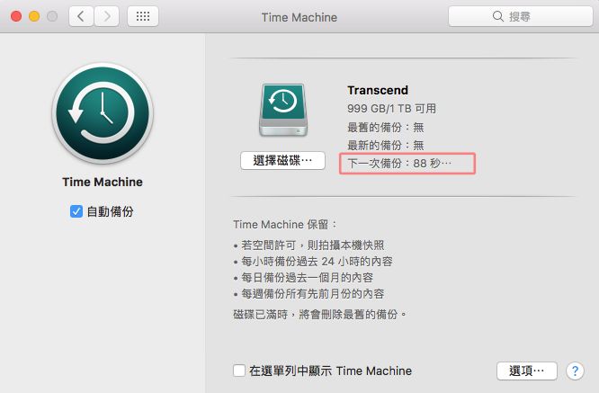 之后的备份你可以选择你要「自动备份」或「立即备份」,「自动备份」就是当你的硬盘一直连接着电脑,那每个小时电脑会备份新的内容,是备份你「新增的或是更改过、移动过」的档案,不会每个小时都从头备份一次,所以每次备份的东西比较少,速度会很快