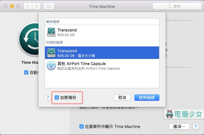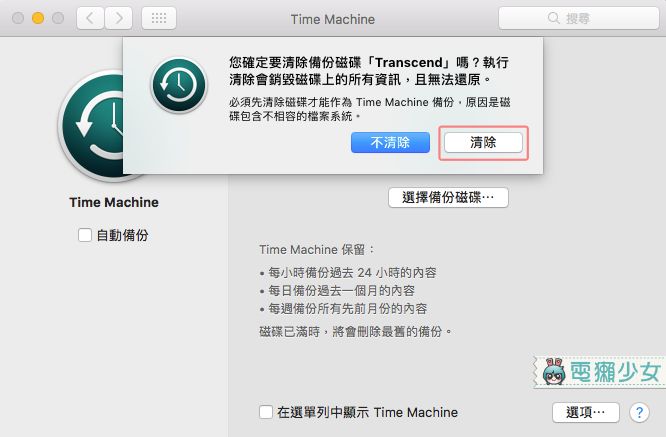 选完要使用的磁盘(及勾选加密备份),系统会要求你清除硬盘裡面的资料才能用Time Machine备份,所以刚刚贝尔就说要准备一个乾淨无资料的硬盘齁~如果跟贝尔一样是拿一块全新的硬盘,清除资料的速度非常快几乎不用等几分钟(因为是空的嘛)。