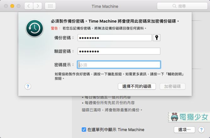 这边帮大家插播一个动作!如果你把档案存在硬盘裡面,有一天硬盘不见了,偷走的人接上电脑就可以轻易回复你的备份,所以大家可以看自己的需求,选择要不要把自己的备份资料加上密码,就算硬盘不见也不怕被人窃取资料啦(嗯?),如果不需要可以直接跳过这步骤了~后续你再次接上硬盘时就会要求你要输入密码,才能看到你备份的资料,贝尔建议要初次备份前就先设定好加密备份,不要像我一样备份完才做加密备份的动作...花了久到我无法理解的时间...(就是我整篇文章已经写完了还没加密好...)。