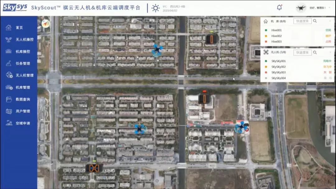 通过SkyScout祺云系统实现了“空地一体”(注:“空”指无人机,“地”指无人机机库)。当用户在前端网站给某一点位的机库安排任务,任务会被推送到云端,智慧机库即可根据任务详情自动调度无人机;在无人机的执勤过程中,机库也会实时回传无人机的系统参数至云端,在中控界面呈现出无人机的状态。