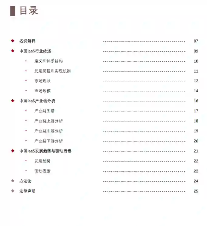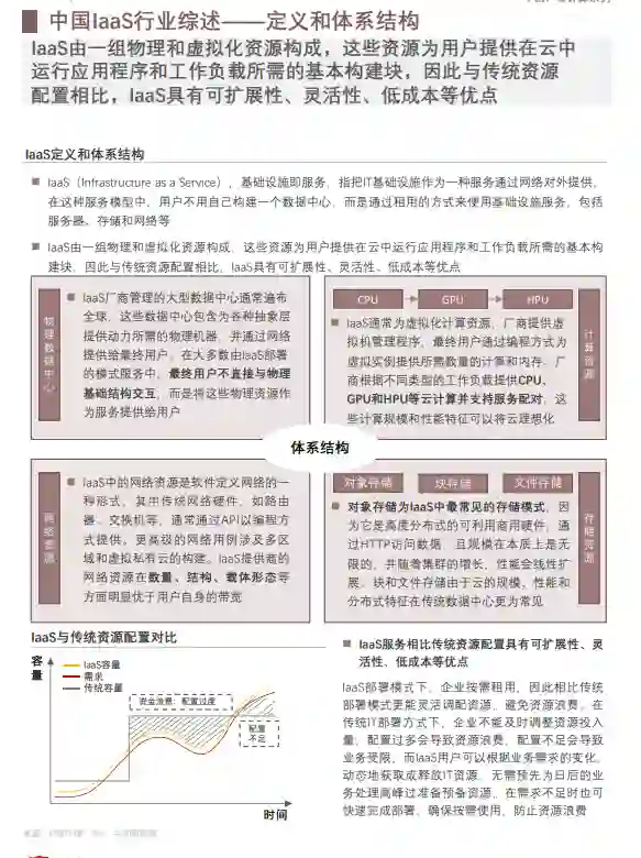 IaaS(Infrastructure as a Service),基础设施 即服务,指把IT基础设施作为一种服务通过网络 对外提供,在这种服务模型中,用户不用自己构 建一个数据中心,而是通过租用的方式来使用基 础设施服务,包括服务器、存储和网络等。IaaS 由一组物理和虚拟化资源构成,这些资源为用户 提供在云中运行应用程序和工作负载所需的基本 构建块,因此与传统资源配置相比,IaaS具有可 扩展性、灵活性、低成本等优点。全球IaaS市场 规模2017年至2021年从307亿美元增长至916亿 美元,复合增长率达31.4%,行业增速呈快速上 升趋势,预计2026年市场规模达到1,898亿美元, 中国IaaS行业市场规模增速快,2021年,中国 IaaS市场规模达1,107.5亿元,过去五年的复合 增长率达到27.8%。2026年中国IaaS市场规模预 计达5,907.9亿元,2021年至2026年复合增长率 达39.8%,一方面,未来在IaaS没有做出关键性 突破的前提下,中国IaaS的市场规模增速将趋于 平稳,保持在30%左右;另一方面,随着IaaS业 务云带来的企业互联网发展和转型,为在互联网 浪潮中保持竞争力,传统的IDC服务商、电信服 务商、网络提供商将转型为IaaS厂商,搭建自身 部署环境的基础设施,减少内部运维成本的同时 为客户提供相关IaaS服务并创造营收,且随着元 宇宙时代的到来,未来IaaS技术将不断成熟与落 地并应用于更多中小企业中,发展潜力巨大。