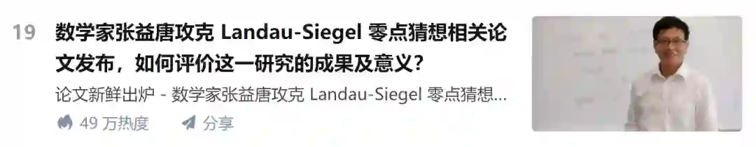 张益唐攻克 Landau-Siegel 零点猜想的相关论文发布后,便登上了知乎热榜。不明觉厉的网友纷纷表示了对张益唐大佬的「膜拜」。