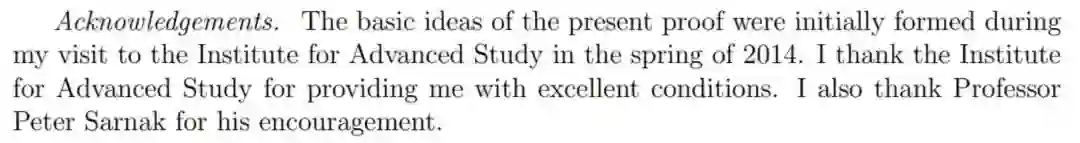 张益唐在致谢中表示,「本证明的基本思路是在他 2014 年访问普林斯顿高等研究院期间初步形成的。他非常感谢普林斯顿高等研究院为自己提供了良好的学术条件,并感谢该院教授 Peter Sarnak 的鼓励。」