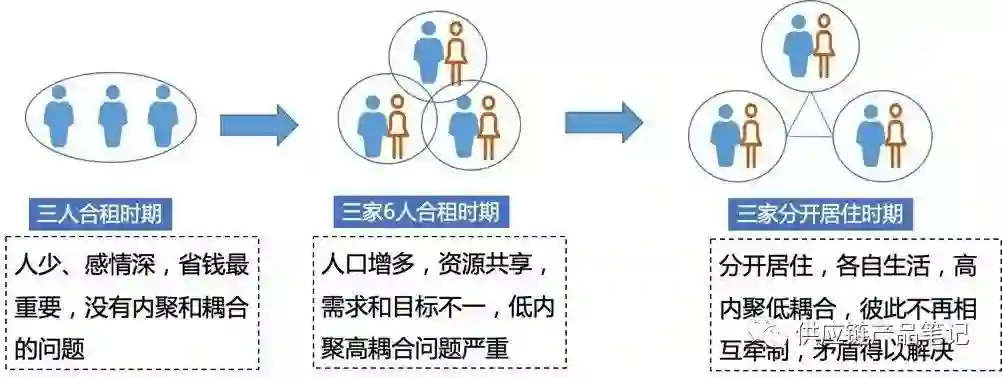 这就是高内聚和低耦合的原理。最初三人合租时,人少、有感情基础,省钱第一,不存在内聚和耦合问题。