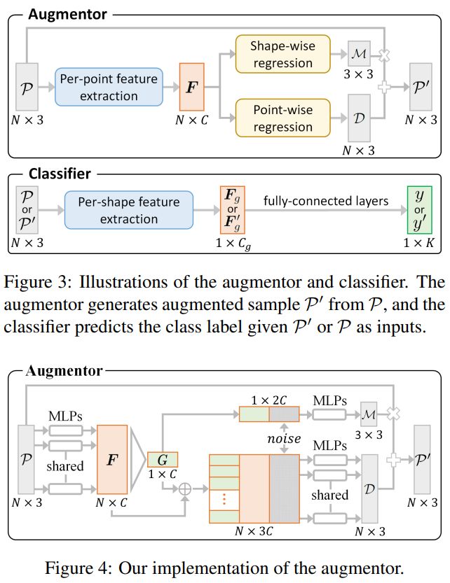这篇论文提出了一个名为PointAugment的点云分类框架,当训练分类网络时,该框架会自动优化和扩充点云样本以丰富数据多样性。与现有的2D图像自动增强方法不同,PointAugment具有样本感知功能,并采用对抗学习策略来共同优化增强器网络和分类网络,学习生成最适合分类器的增强样本。PointAugment根据形状分类器和点位移来构造可学习的点增强函数,并根据分类器的学习进度精心设计损失函数以采用增强样本。PointAugment在改善形状分类和检索中的有效性和鲁棒性得到了实验的验证。
