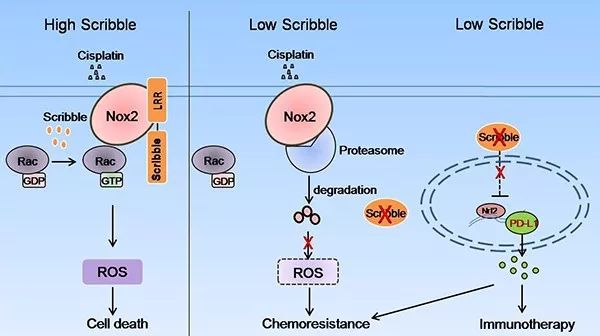 詹丽杏课题组的研究人员利用临床收集的115例NSCLC患者的化疗前肿瘤组织样本,分析Scribble蛋白水平与铂类药物化疗预后的相关性;并在另外72例NSCLC患者肿瘤组织样本中验证了Scribble蛋白水平与铂类药物化疗预后正相关。进一步证明了Scribble功能异常显著降低了顺铂敏感性。体外分子机制研究发现,Scribble与Nox2在细胞膜上共定位,而且Scribble通过LRR结构域与Nox2相互结合并增强Nox2蛋白稳定性。在顺铂处理的NSCLC细胞中,Scribble对Nox2蛋白的稳定有利于ROS的大量产生进而促进细胞凋亡,增强顺铂敏感性。Nrf2(Nuclear factor, erythroid 2 like 2)是ROS产生的重要调节因子;在黑色素瘤中Nrf2上调PD-L1表达且PD-L1促进肺癌化疗耐药产生。研究人员利用数据库分析和Kras肺癌模型小鼠,发现在NSCLC组织样本和耐药细胞株中,Scribble与NRF2/PDL-1显著负相关。体外研究发现,Scribble通过抑制Nrf2转录进而降低PD-L1水平,而且Scribble对Nrf2/PD-L1的负向调控部分依赖Scribble/Nox2/ROS信号通路。该研究发现了Scribble调控NSCLC顺铂化疗敏感性的作用和机制,并提出Scribble高表达的NSCLC患者在铂类药物化疗中预后较好,而Scribble低表达的NSCLC患者应更倾向于选择基于PD-L1/PD-1免疫抑制剂的免疫治疗,为实现NSCLC的个性化治疗提供靶标。