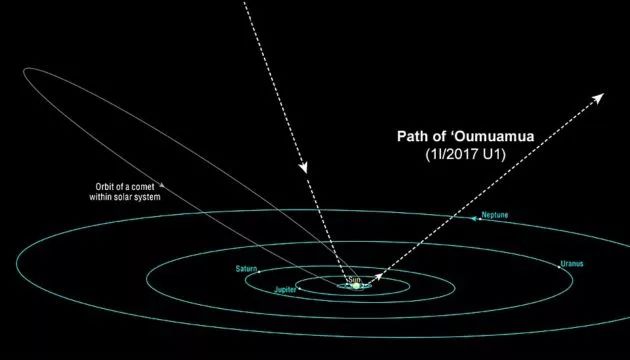 近日,位于美国夏威夷的美国国家航空航天局(NASA)泛星巡天望远镜,意外地发现太阳系中出现了一位“不速之客”,距离地球大约0.25个天文单位(即37600000公里),是人类首次在太阳系内发现的系外天体。它的体积并不大,直径仅仅只有数百米,科学家将其命名为Oumuamua,意为“远方的信使”。它在太阳系只是做短暂的逗留,目前正在驶离太阳系,但科学家正在抓住这个机会,对其进行详细了解,其结果可能将有助于我们对它所在星系起源及历史进行研究。