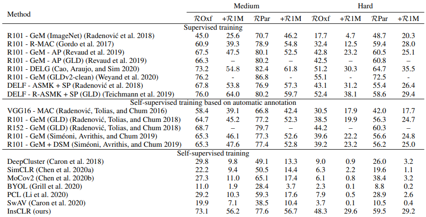 可以看到,在两个常见的实例检索数据集上,我们的方法已经超过了部分有监督的方法,而采用相同训练集的有监督方法R101 - GeM (GLDv2-clean),在某些指标上我们也与之比较接近。