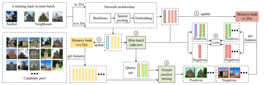 每次训练,首先随机选择 个训练元组,不同的训练元组具有不同的标签,随后,如图中左上部分所示,这64张图像会有两个版本,经过数据增强的(w/ DA)和没有经过数据增强的(w/o DA),这两种版本的图像都会经过模型得到特征,然后更新相应的Memory bank,如图中步骤1所示。w/ DA的Memory bank,其用法和XBM一样,用于损失计算。而w/o DA的Memory bank,其作用是图像间的相似性计算,相似性在Mini-batch selection和Pseudo positive mining中,是判断某图像是否是正样本的重要指标。使用w/o DA的Memory bank而不是w/ DA的,原因在于数据增强具有随机性,以此得到的相似性是不可靠的,实验也表明(论文部分图4),如果使用w/ DA的Memory bank计算相似性,效果会非常差。