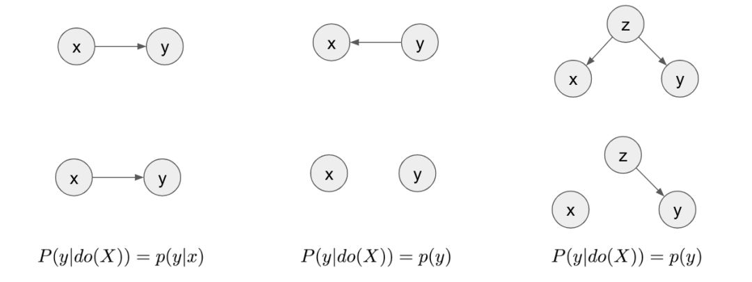 第一行的三个图描述了这三个脚本。第二行是变换后的图,在这些图中删除了所有指向 x 的边。在第一个脚本中,图在变换前后看起来是一样的。从这一点看,我们可以总结出 p(y|do(x))=p(y|x),也就是说在 x=3 时的 y 的分布和在 x=3 时的 y 的条件分布是一样的。在第二个脚本中,在变换后 x 和 y 中不再有任何连接,因此它们是相互独立的。从这一点看,我们可以总结出 p(y|do(X=3))=p(y)。改变 x 的值对 y 的值不会产生影响,所以无论你将 x 设置为多少,y 都只是从它的边际分布中抽样得到的。这一点也适用于第三张因果图。