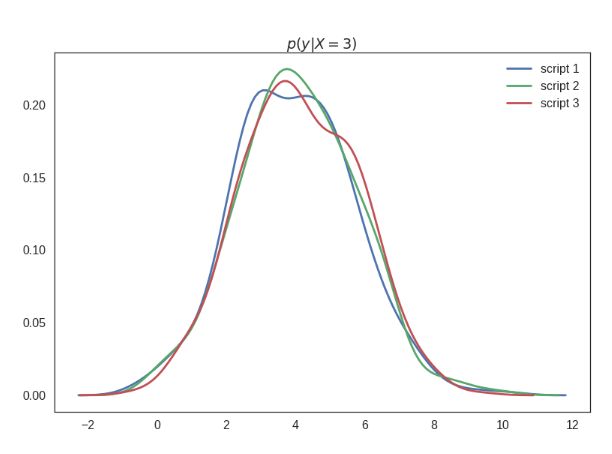 我将这个图标记为 p(y|do(X=3)),从语义上讲这是指在将 x 的值设置为 3 的干预下的 y 的分布。一般这和条件分布 p(y|x=3) 是不同的,当然这三个脚本都是一样的。下面我将展示这些条件——请原谅这里的估计误差比较多,因为我真的懒得做这些图了,但请相信我从技术上来讲它们都是相同的: