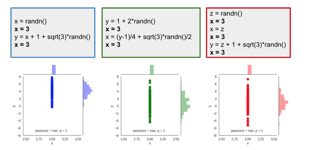 我通过反复执行这些脚本绘制了样本点。如你所见,这三个脚本在 x - y 坐标图上生成了相同的联合分布。你可以将这些分布馈送到 two-sample test 中,然后你就会发现它们确实很难区分。