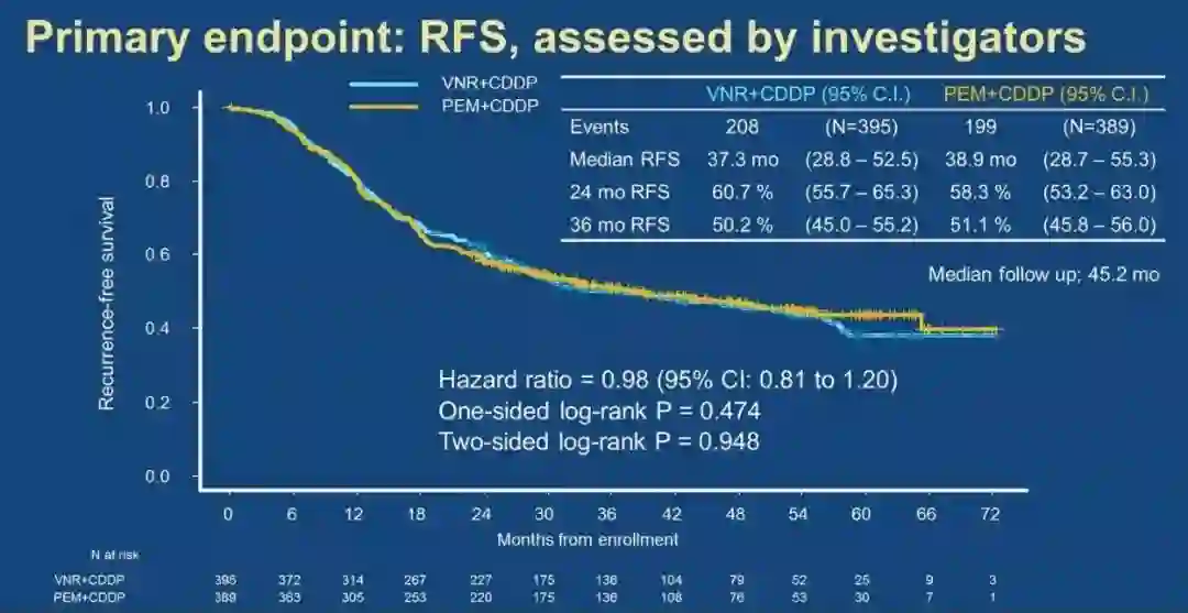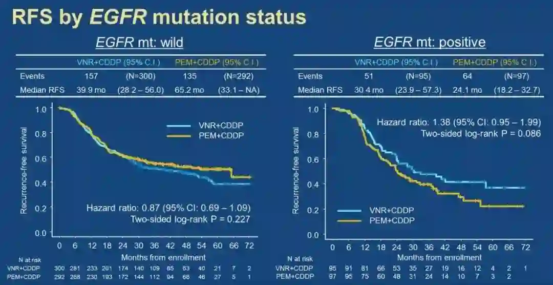 本次ASCO年会上,来自日本的Ⅲ期JIPANG研究[4]结果公布,该研究比较了AP方案和NP方案在非鳞NSCLC术后辅助化疗中的疗效和安全性,主要研究终点为无复发生存期(Recurrence-free survival,RFS),次要终点包括OS、治疗完成率和毒性。对784例患者进行了疗效分析,在RFS上,AP方案和NP方案疗效相似,无统计学差异(中位RFS分别为38.9个月和37.3个月;HR=0.98,95%CI, 0.81~1.20,P=0.948)。亚组分析中,AP方案在EGFR野生型患者中有更长的RFS,尽管两组无统计学差异(中位RFS分别为65.2个月和39.9个月;HR=0.87,95%CI,0.69~1.09,P=0.227)
