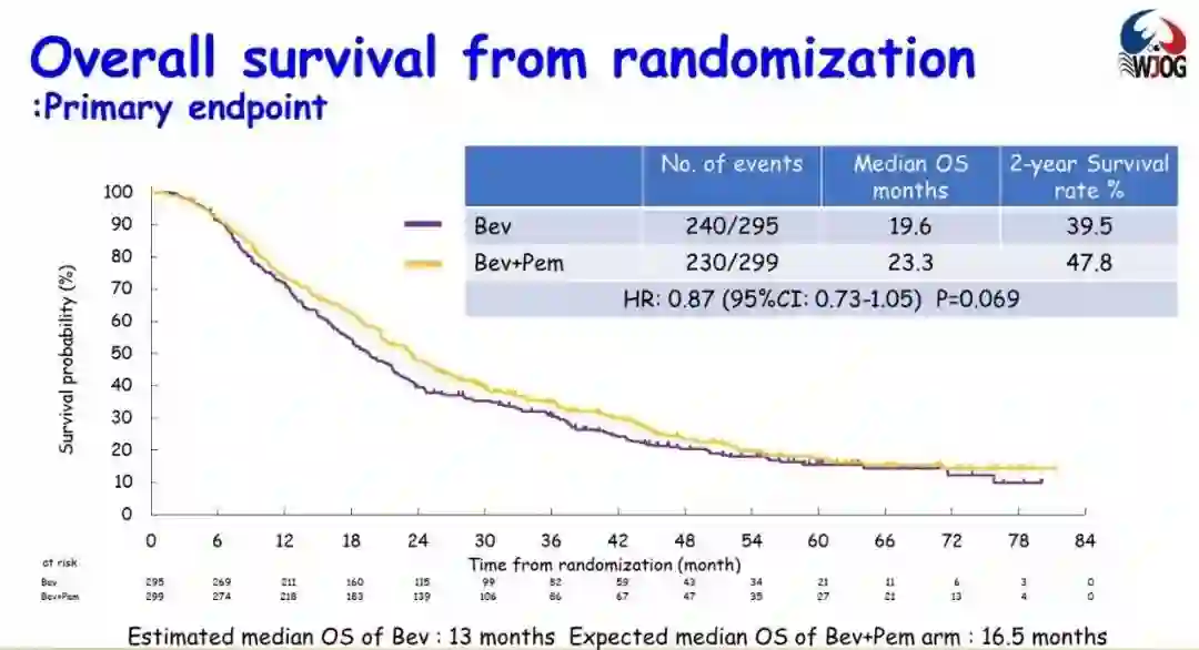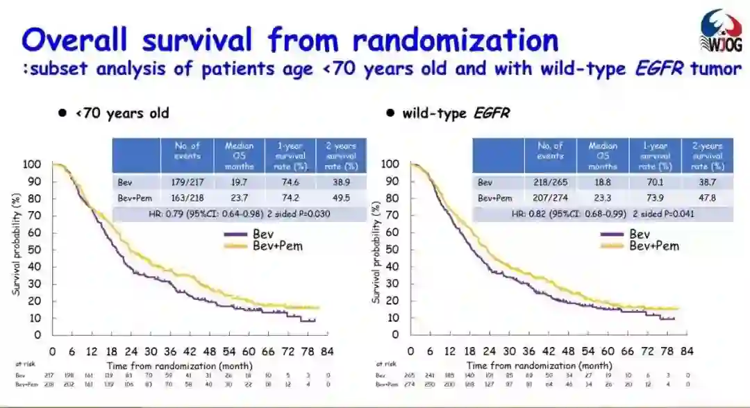 既往AVAPERL研究显示,相比于单药贝伐珠单抗维持治疗,贝伐珠单抗+培美曲塞维持治疗可以延长晚期NSCLC患者的PFS和OS。今年ASCO年会上,COMPASS研究[6]进行培美曲塞和卡铂+贝伐珠单抗诱导治疗后的维持治疗方案探索,研究入组了775例EGFR野生型的晚期非鳞NSCLC患者。研究结果显示,在主要终点OS上,贝伐珠单抗联合培美曲塞与贝伐珠单抗单药相比,两组OS并无显著差异(中位OS分别为23.3个月和19.6个月;HR=0.87,95%CI 0.73~1.05,P=0.069),但亚组分析中,年龄70岁以下或EGFR野生型患者可能从贝伐珠单抗联合培美曲塞维持治疗中获得OS获益。