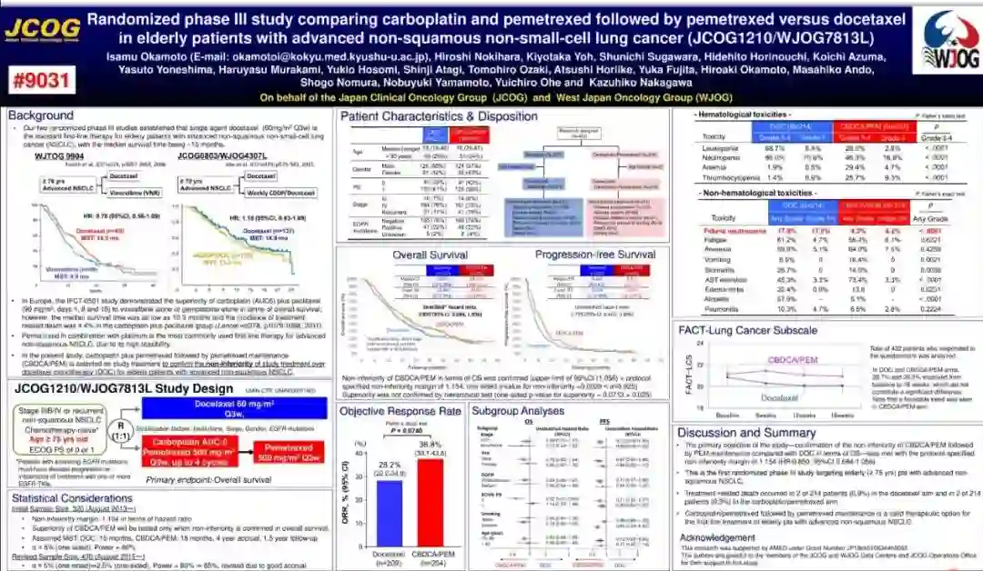 今年ASCO年会上,Ⅲ期WJOG7813L研究[5]结果显示,在接受培美曲塞联合卡铂化疗后的晚期非鳞NSCLC老年患者中,与多西他赛维持治疗相比,培美曲塞维持治疗显著延长了患者的OS和PFS,同时有更好的安全性和更好的生活质量,该研究再次证明了培美曲塞维持治疗的优势。