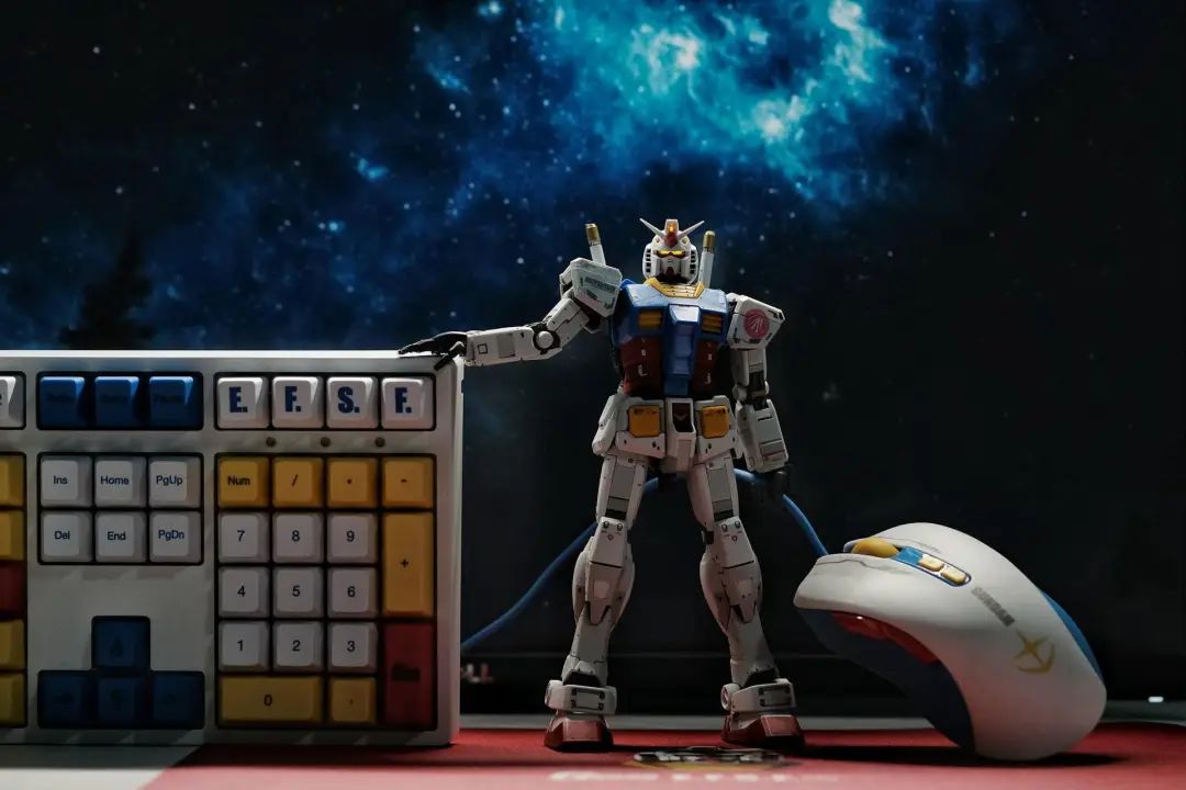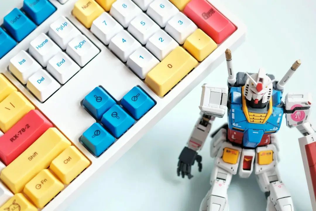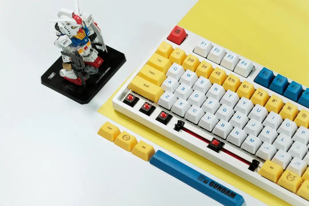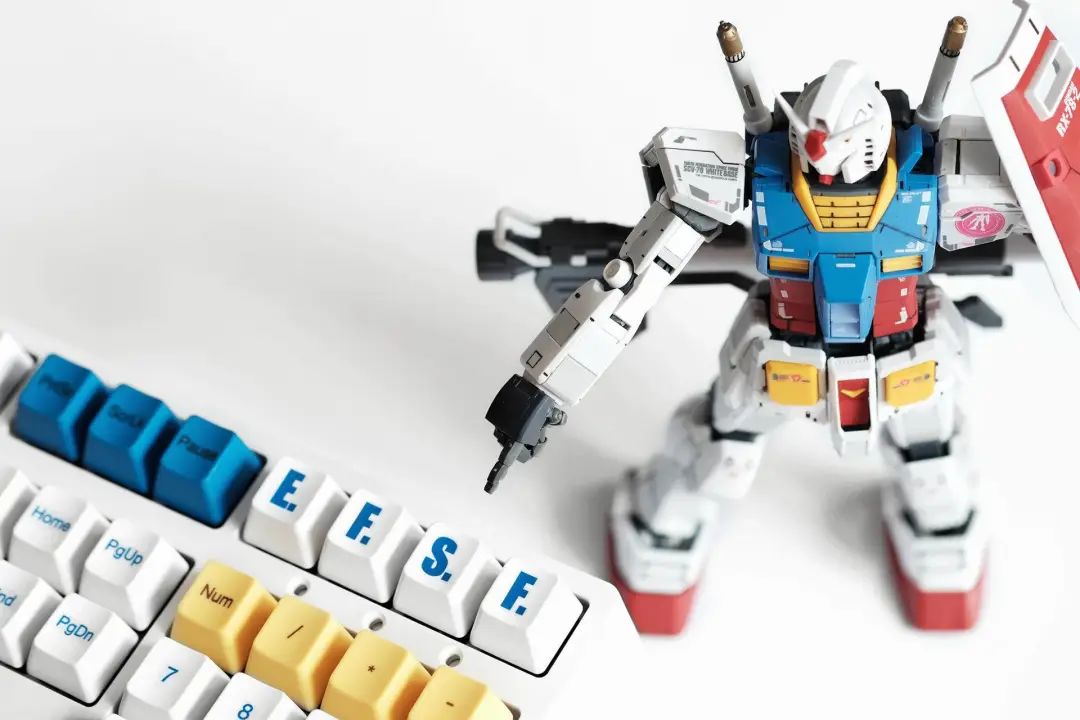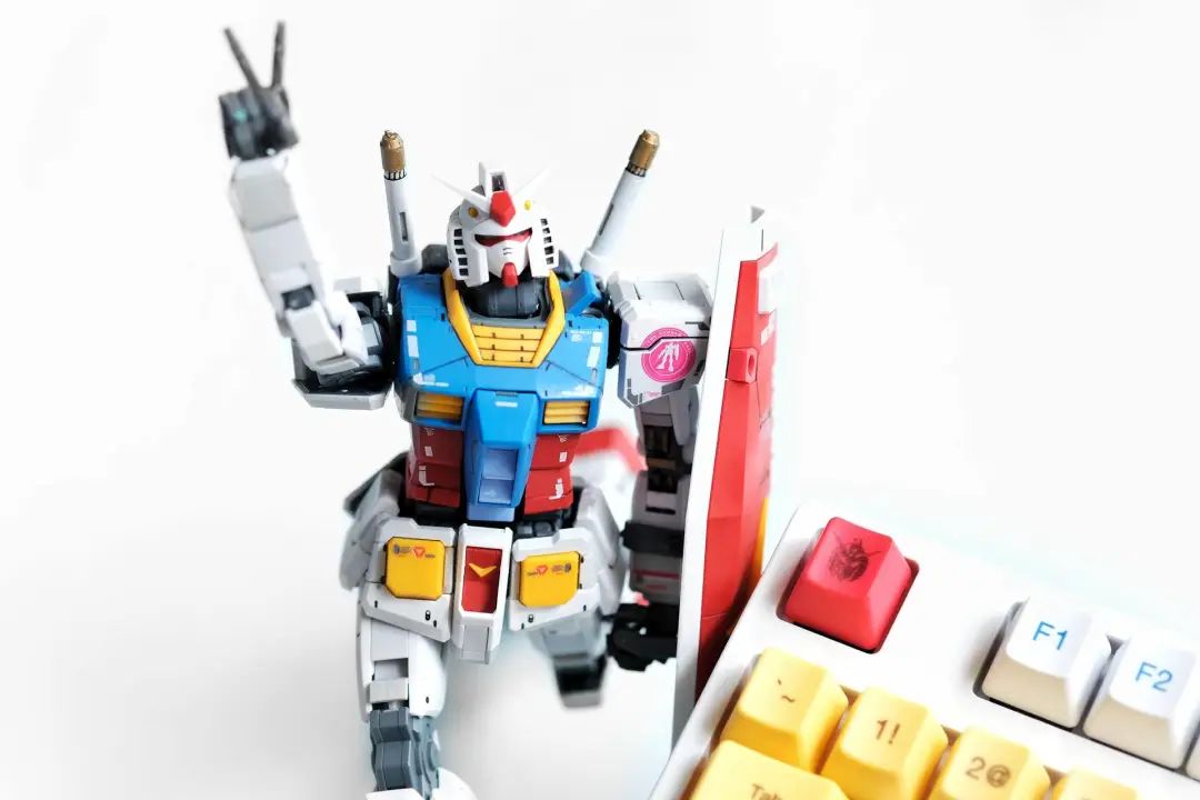 先来说说键盘,采用了 108 键设计,在 104 全键基础上再增加了 4 个多功能键,键帽采用 PBT 材质,配色以红蓝黄白为主,这也是 RX-78-2 机体的经典配色。除了配色之外,键帽上的图案也采用了非常多的经典高达元素,我们不妨来来一起看看 ikbc 给了我们多少彩蛋: