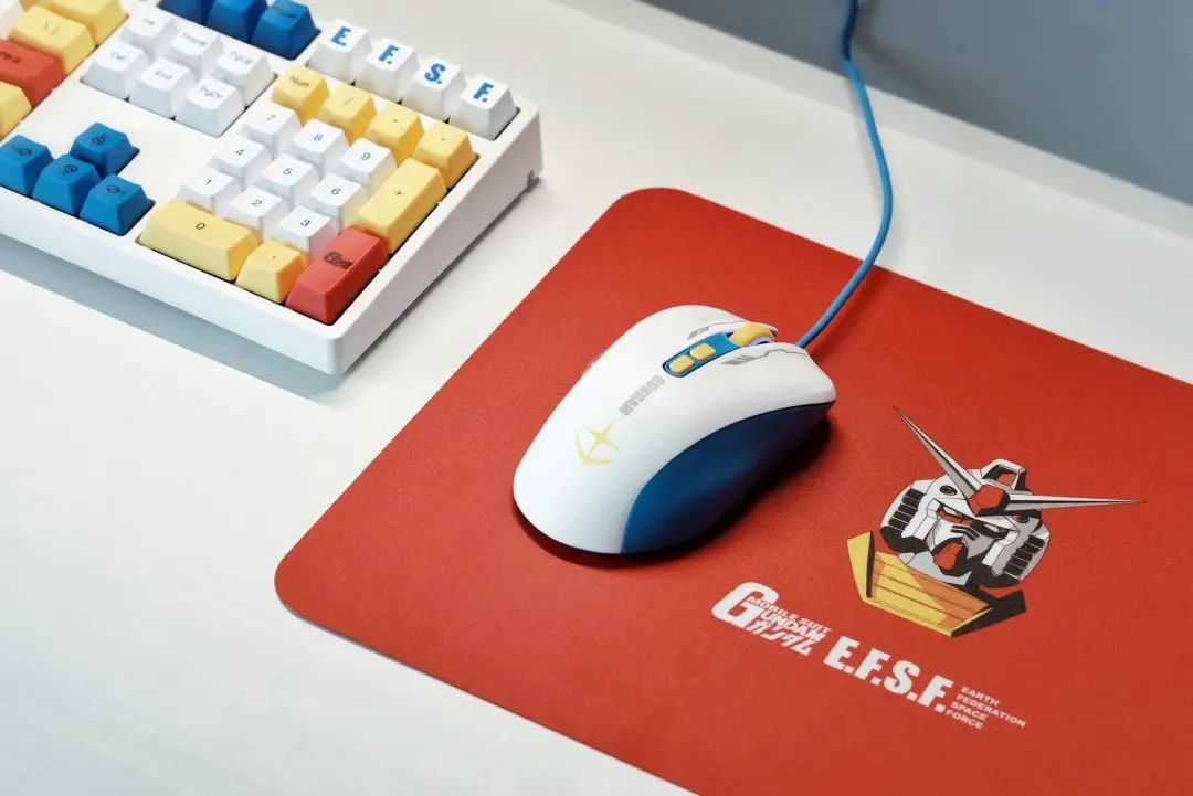 在我看来,一套键鼠套装应该是包括键盘鼠标、鼠标垫以及键盘手托的,不过手托这次是没有了,但鼠标垫却是可以附加购买的,0.5mm 厚度,聚碳酸酯材质,表面微磨砂触感,有红黄蓝三色可选,图案均为 RX-78-2 头部特写以及机动战士高达 logo,底部设计了吸附粘连设计,放在桌面不会轻易滑动,配合上高达键鼠套装,凑个小全套看起来也挺不错。
