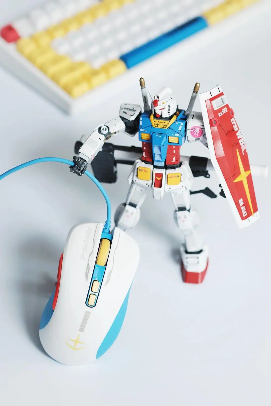 接着再来看看鼠标,说实话 ikbc 一直给我的印象都是以做键盘为主,鼠标这条产品线出品真不多,这款高达定制款光磁鼠标算是一个新的尝试,配色整体和键盘呼应,也是采用了RX- 78-2 机体上的红蓝黄白4种颜色,并且顶部也印有 “ RX-78-2 ”、“ GUNDAM ” 字样以及地球联邦宇宙军的 logo,和 MG 元组 3.0 放在一起,差点就以为鼠标上的这些图案也是水贴印上去的了。