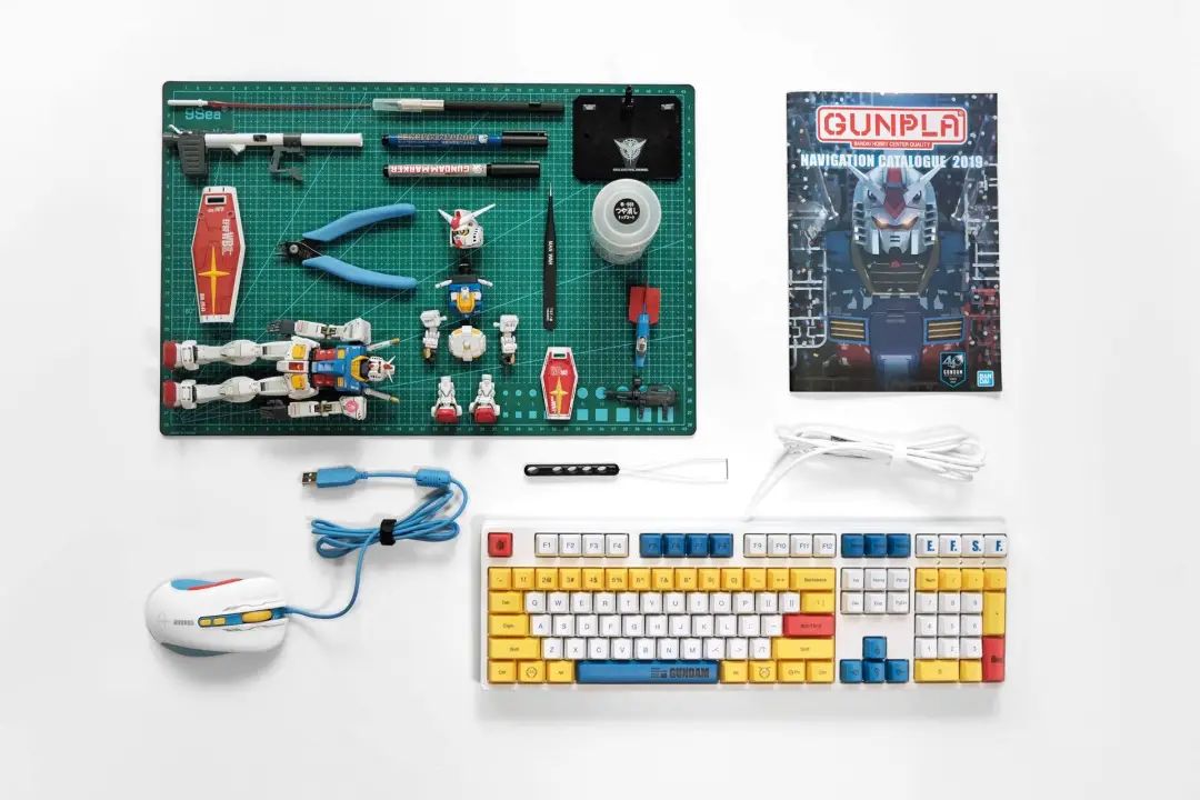 虽说是套装,但是键盘和鼠标是分开包装的,如果你玩胶时也是个盒控,那你绝对能体会盒体八角尖尖的快感。这套键鼠的外包装设计十分一致,简单直白的 RX-78-2 的形象搭配黄蓝白的配色,确实是地地道道的元祖口味没错。