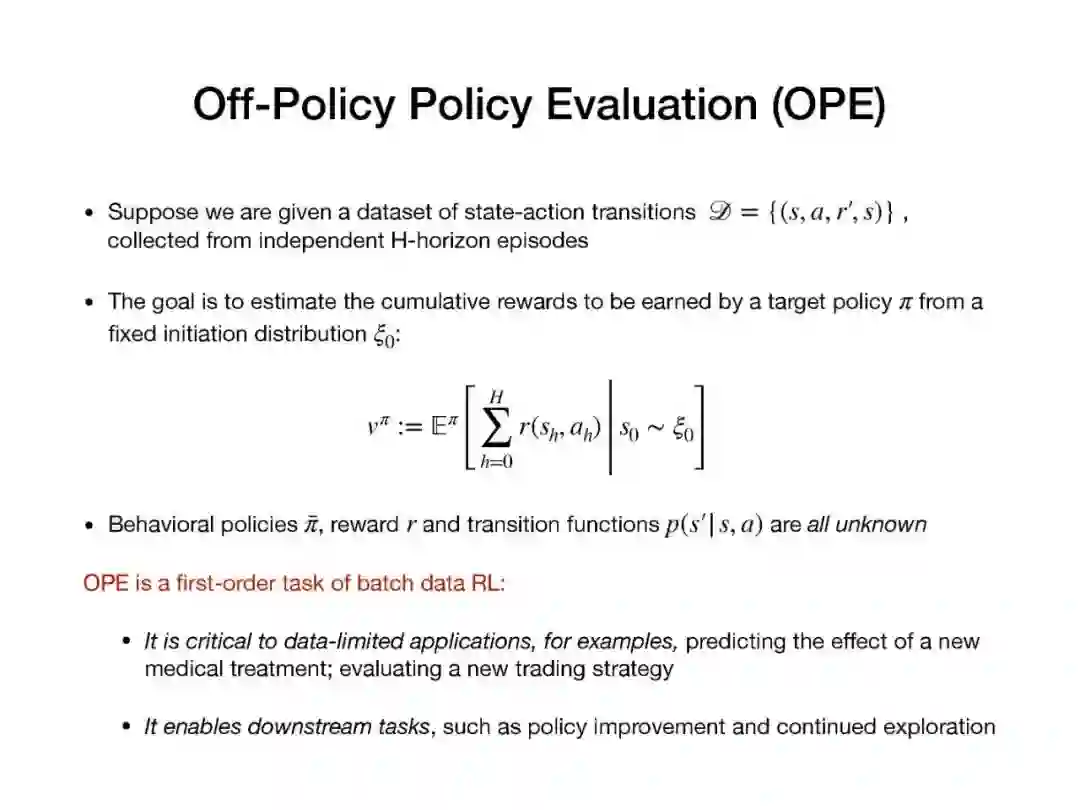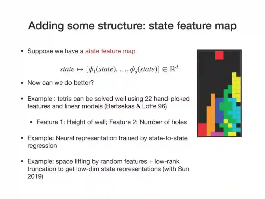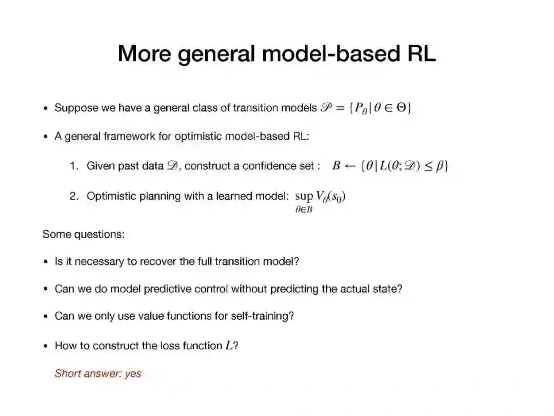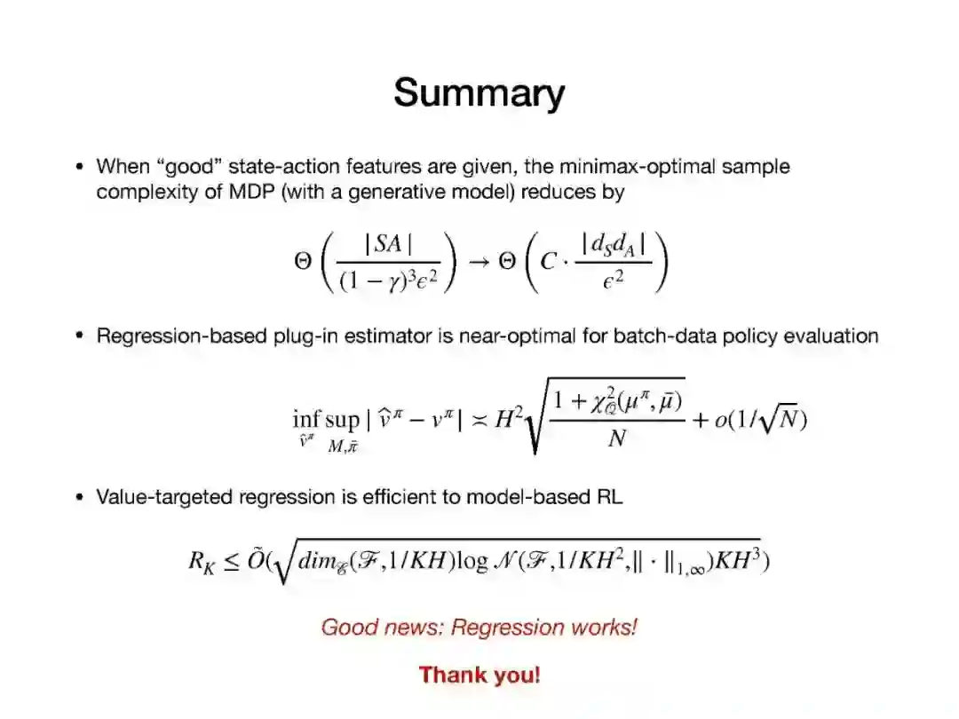 近年来,强化学习(RL)的经验研究取得了越来越多的成功。然而,关于学习能力的许多理论问题并没有得到很好的理解。例如,要学习一个好的策略,需要多少观察?马尔可夫决策过程(MDP)中函数近似在线学习的遗憾之处是什么?从未知行为策略生成的日志历史记录中,我们如何最优地估计新策略的价值?在本次演讲中,我将回顾一些最近研究这些问题的成果,如从生成模型求解MDP的最小轴最优样本复杂性,通过回归的最小轴最优非策略评估,以及使用非参数模型估计的在线RL的遗憾。
