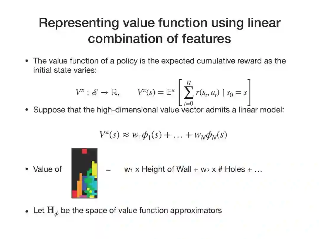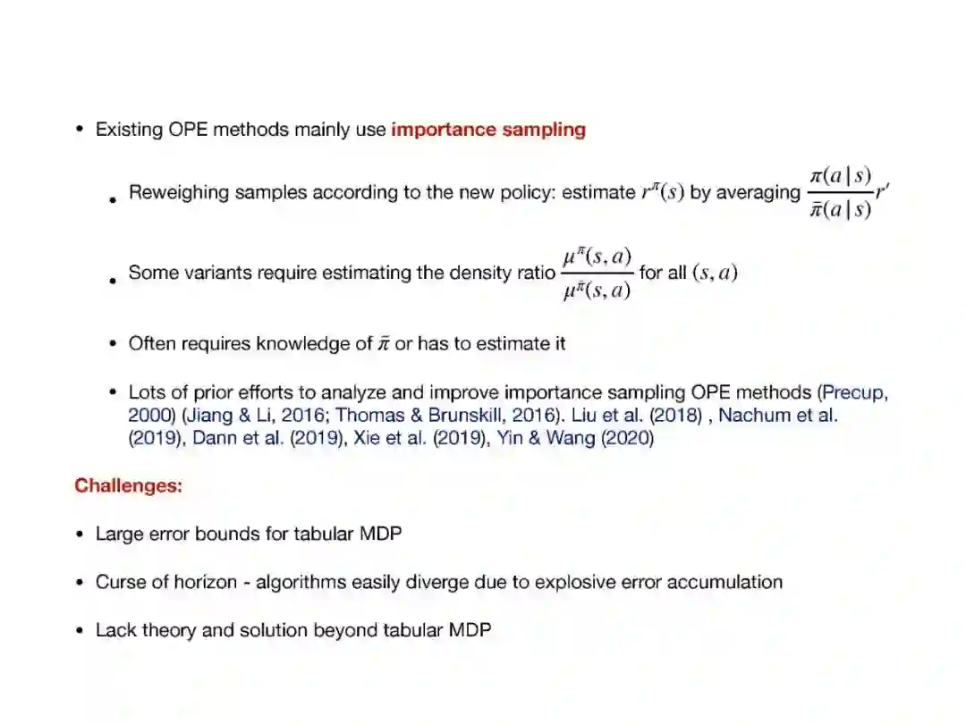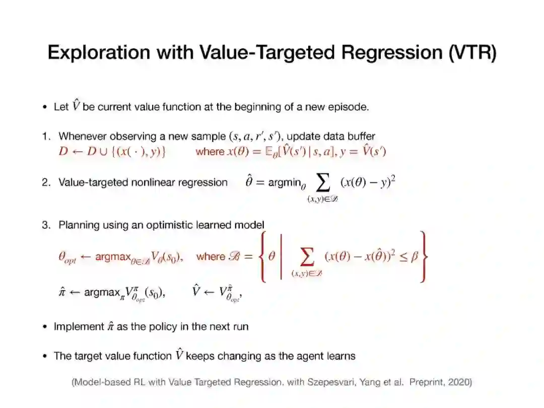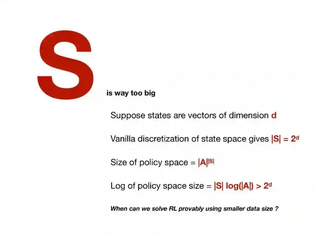 近年来,强化学习(RL)的经验研究取得了越来越多的成功。然而,关于学习能力的许多理论问题并没有得到很好的理解。例如,要学习一个好的策略,需要多少观察?马尔可夫决策过程(MDP)中函数近似在线学习的遗憾之处是什么?从未知行为策略生成的日志历史记录中,我们如何最优地估计新策略的价值?在本次演讲中,我将回顾一些最近研究这些问题的成果,如从生成模型求解MDP的最小轴最优样本复杂性,通过回归的最小轴最优非策略评估,以及使用非参数模型估计的在线RL的遗憾。