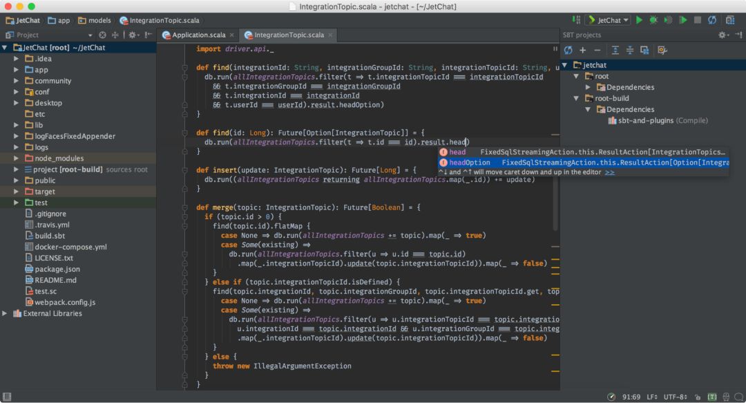 IntelliJ IDEA是另一个JetBrains出品的知名IDE。Scala插件使IntelliJ IDE可以支持Scala、SBT、Scala.js、Hocon、Play框架。