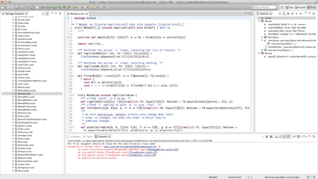 Scala IDE for Eclipse为开发纯Scala应用及Scala-Java混合应用提供了高级编辑、调试支持,可以在Scala和Java引用之间跳转。
