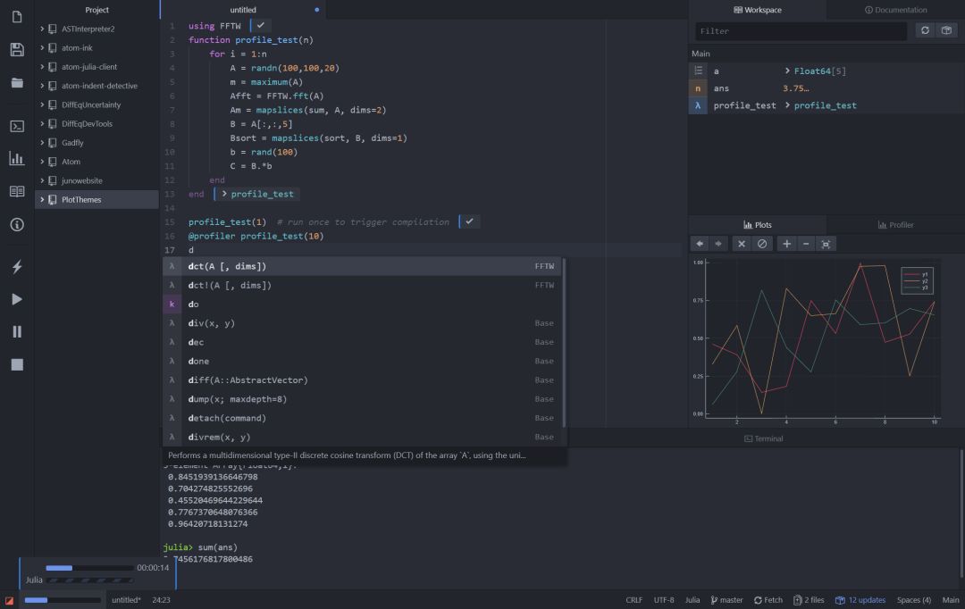 Juno同时包含Julia和Atom包,以提供Julia特定的增强,例如语法高亮,绘图面板,集成Julia调试器Gallium,运行代码的控制台,等等。