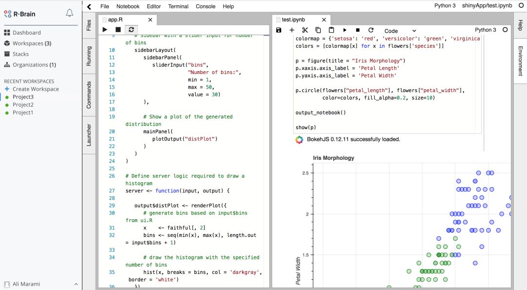 R-Brain以灵活的用户界面提供了经典的Jupyter notebook的标准功能(交互式notebook、终端、文本编辑器、文件浏览器、丰富的输出形式,等等)。它使用了Docker容器技术,所以这一解决方案可以方便地部署在云上或内部服务器上。