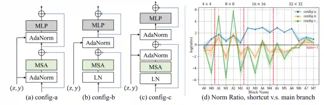 一个尝试是在Transformer块中直接采用AdaLN,但没有取得效果。特别是研究人员发现FID在前期的训练不再下降了。为了找到故障的发生处,研究人员又绘制了此基线配置的标准比率。存在多个具有高范数比的块,表明主分支中的一些AdaNorm层对中间特征的贡献很小,导致条件信息丢失。