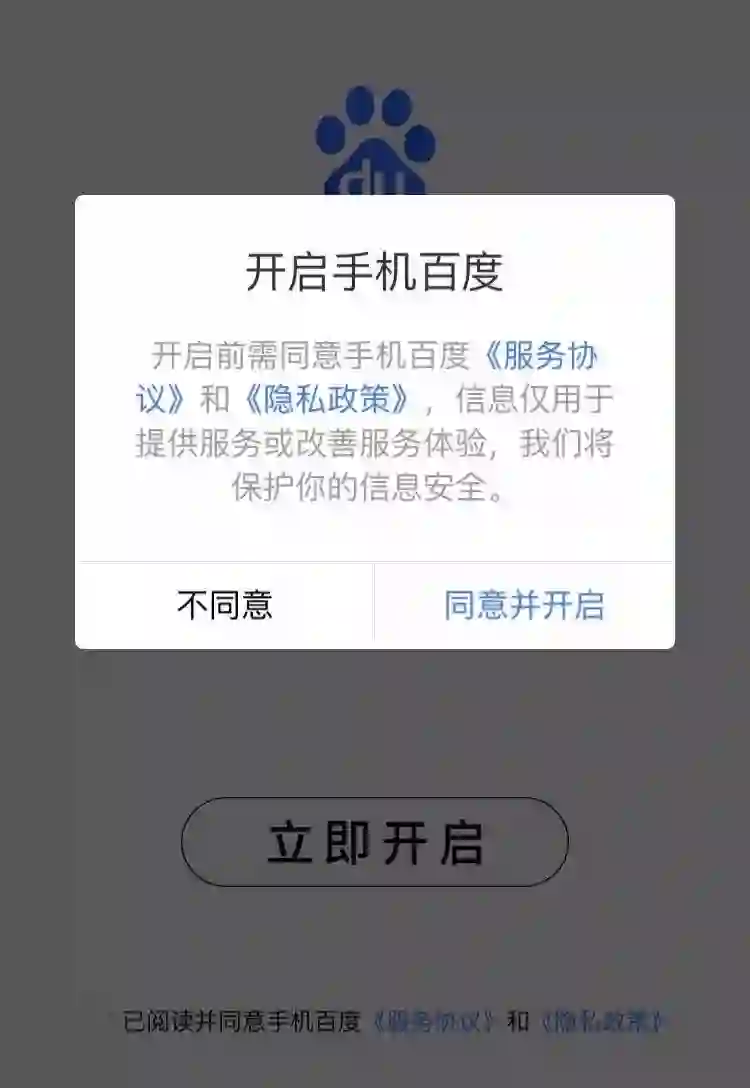 初次安装手机百度App时,页面都会提示默认勾选“已阅读并同意手机百度《服务协议》和《隐私政策》”,如取消勾选则无法使用该应用。那么,这就造成了一种强制性,如果不同意该协议就无法安装App,但如果仔细阅读以上《服务协议》就可以发现:一旦用户使用App产生的数据则是归企业所有,而App就这样“合理合法”有了获取用户信息的途径。