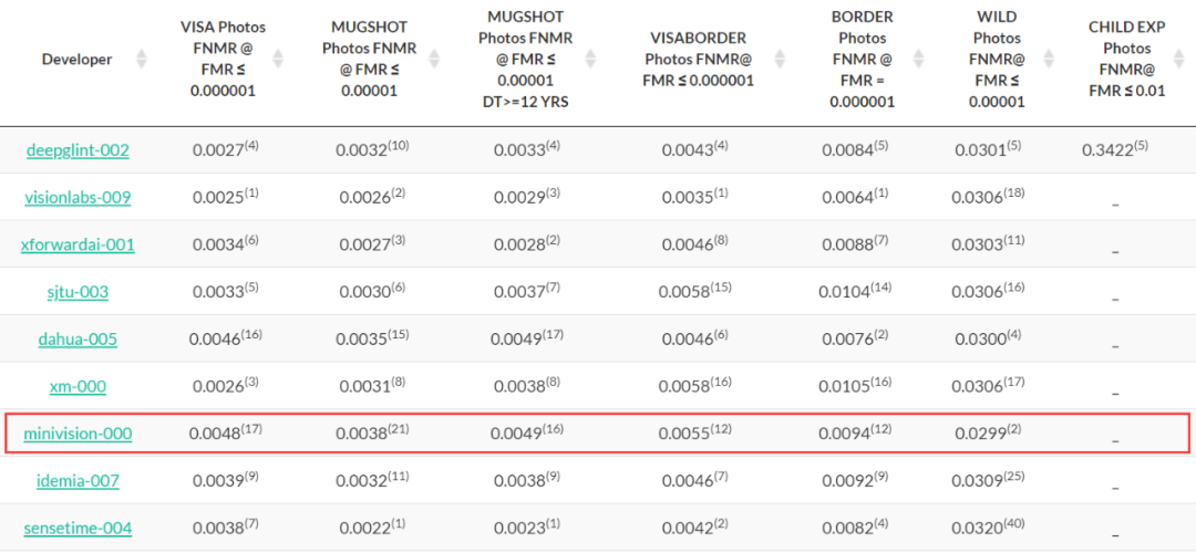 FRVT 竞赛目前的准确度综合排行榜,minivision 即小视科技团队的成绩。