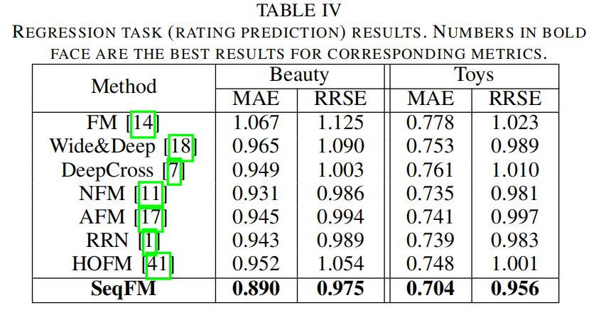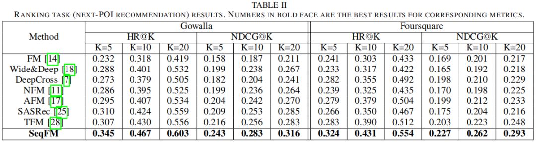 作者在不同的任务和不同的数据集上均进行了大量实验,验证了本文提出的 SeqFM 的有效性,也验证了本文提出的 SeqFM 在处理动态序列特征时相比于传统的基于 FM 的方法简单的将所有动态特征作为普通无序集合特征处理对于时序预测分析更有帮助。