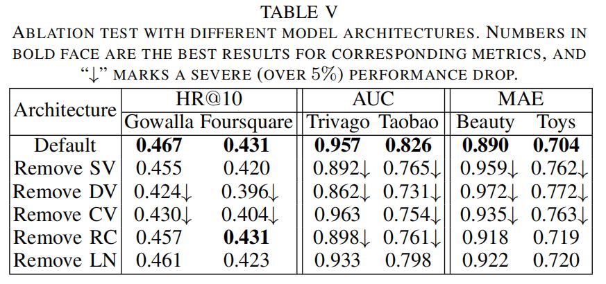 去掉 Dynamic View 后在分类任务中有非常严重的指标下跌 Trivago ( 10% )和 Taobao ( 12% )。作者给出的解释是这些数据集中包含大量的点击行为日志,这些动态特征序列携带着每个用户的长期偏好信息。